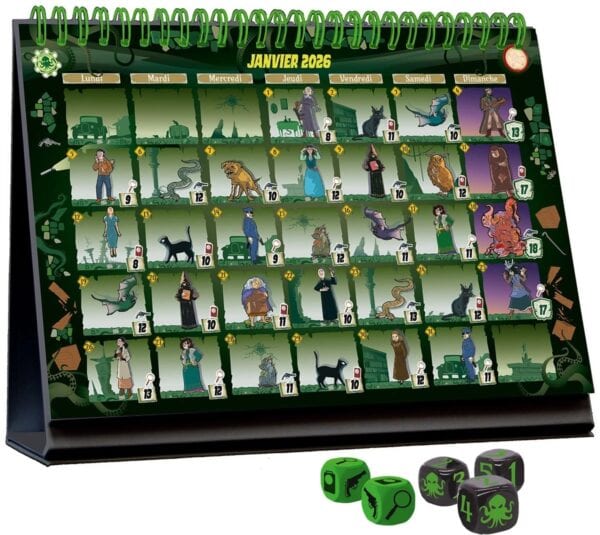 365 Aventures – Cthulhu est un calendrier mais aussi un jeu d’aventure et de défis en solo qui vous accompagnera tout au long de l’année. Posez-le sur votre bureau et, chaque jour, préparez-vous à affronter un nouveau monstre, du 1er janvier au 31 décembre !