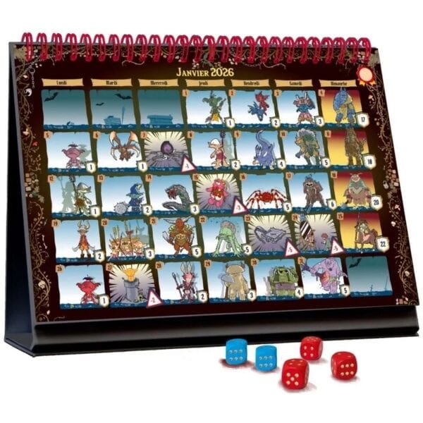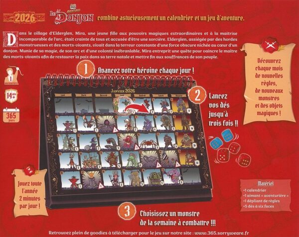 365 Aventures – Le Donjon est un calendrier mais aussi un jeu d’aventure et de défis en solo qui vous accompagnera tout au long de l’année. Posez-le sur votre bureau et, chaque jour, préparez-vous à affronter un nouveau monstre, du 1er janvier au 31 décembre !