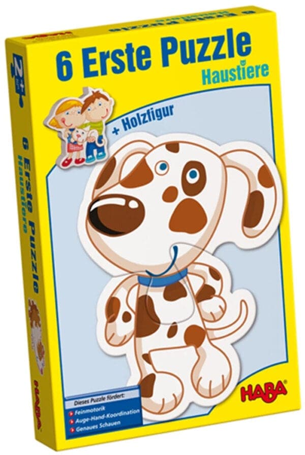 Six premiers puzzles pour les plus petits. Pour apprendre et jouer en s’amusant. Des grandes pièces pour petites mains. 6 super motifs à classer : quel animal mange quoi ? Avec figurine en bois pour jeu libre.