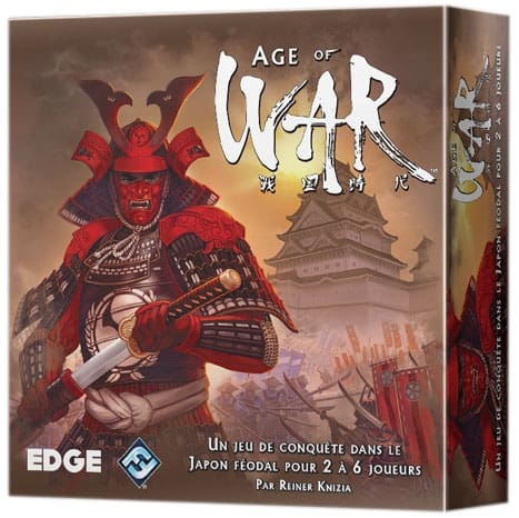 Le Japon féodal est en proie à la guerre et aux querelles intestines. La lignée impériale est affaiblie, des seigneurs de guerre en profitent, attaquant et pillant sans vergogne les clans voisins. Pour réunifier les clans, un chef va devoir se distinguer des autres. Serez-vous celui-là ? Dans le jeu Age of War, vous représentez un daimyo au coeur d’une période de conflits entre les états du Japon. Pour établir votre domination sur le pays tout entier, vous devez faire la guerre aux daimyos rivaux, conquérir des châteaux et unifier les clans de la région sous votre bannière. À la fin de la partie, le soutien qui s’est attiré le plus de soutien de la part des clans japonais devient le prochain souverain du pays ! Au début d’une partie d’Age of War, les 14 cartes représentant les châteaux affiliés à chaque clan sont disposées au centre de la zone de jeu. À chaque tour, vous devrez tenter de conquérir l’un d’eux en l’assiégeant avec vos armées. Votre assaut sur un château débute lorsque vous lancez 7 dés personnalisés afin de savoir quels soldats répondent à votre appel à la guerre. Vous pouvez enrôler infanterie, archers, cavalerie, et même des daimyos fidèles à votre cause. En utilisant les résultats des dés, il vous faut alors remplir l’une des lignes de bataille de la forteresse assiégée. Si vous y parvenez, vous placez les dés utilisés sur la carte Château et relancez les dés restants pour intensifier votre attaque. Les châteaux peuvent offrir de solides bastions, mais la vraie solidarité du Japon vient de ses clans. Si vous espérez devenir le daimyo suprême, il vous faudra unifier les clans sous votre loi. Leur taille et leur prestige varie largement &ndash. les Shimazu ne possèdent qu’un seul château, tandis que les puissants Oda en ont 4. Unifier entièrement un clan est la seule manière de conserver vos châteaux hors de portée des armées adverses. Pour devenir le dirigeant suprême du Japon, vous devrez faire preuve d’un esprit tactique vif et d’une volonté inébranlable. Rassemblez vos loyales armées, préparez-vous pour la bataille.