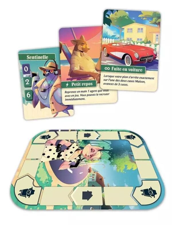 Dans le jeu Agent Avenue, vous incarnez d’anciens espions vivant dans un quartier résidentiel, cherchant à se surpasser grâce à des cartes qui rapportent des points ou déclenchent des effets spéciaux.