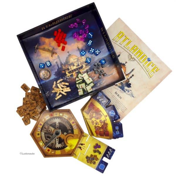 Le cataclysme a débuté, noyant l’Atlantide sous les flots. La dernière cité de l’île mythique est sur le point d’être engloutie. Vous, les derniers Atlantes, tentez de sauver ce qui peut l’être avant de fuir devant la fureur des éléments. L’heure tourne. Vous n’avez que peu de temps pour rassembler les richesses de l’Atlantide. Dans le jeu Atlandice, visitez les quartiers de la cité en empruntant les portes ouvertes. Utilisez intelligemment les installations de la ville afin de réunir le maximum de ressources. Gardez un oeil sur les quartiers qui se vident de leurs richesses et sur l’horloge qui marque le temps restant avant la fin du jeu. Gagnez du prestige en collectant plus de ressources que vos adversaires à des moments-clés de la partie et à la fin du jeu. Au début de chaque tour, le premier joueur lance tous les dés et les attribue aux Quartiers correspondants. (Par exemple, les dés de valeur 1 sont placés à côté du Quartier des Bijoutiers.) Sur chaque secteur de la ville se trouvent des ressources : des gemmes chez les bijoutiers, des livres à la Bibliothèque, des provisions dans les auberges, des outils dans les machineries, des armes dans les forges. Puis, en commençant par le premier joueur et dans le sens horaire, chaque joueur : choisit un dé, puis prend une ressource sur le quartier de ce dé, enfin applique l’effet du quartier choisi. La partie prend fin lorsque l’aiguille de l’horloge atteint la dernière case. Alors pour chaque ressource, on attribue 3 points de victoire au joueur qui en possède le plus, et un point de victoire au second. Le joueur qui possède le plus de points de victoire remporte la partie. Le tour de table se poursuit jusqu’à ce que tous les joueurs aient pris deux dés chacun.