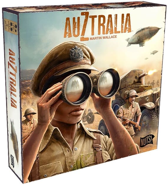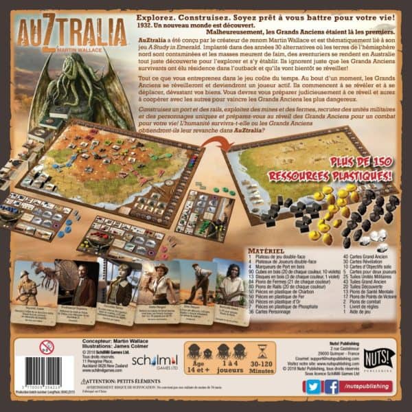 AuZtralia se déroule dans des années 30 alternatives où l’humanité, enfin libérée du joug des Grands Anciens, découvre l’Australie… et ses sombres habitants ! Ce jeu est la suite thématique de A Study In Emerald de Martin Wallace. De votre port sur la côte de l’Australie, vous construirez une ligne de chemin de fer vers l’intérieur des terres pour exploiter des mines et établir des fermes. Votre Plateau de Joueur représente les ressources et les unités militaires présentes dans votre port. Tout ce que vous entreprenez dans le jeu coûte du temps. Vous devenez le joueur actif quand votre disque est sur l’espace le plus bas de la Piste de Temps. Vous prenez alors un des cubes de votre QG et le placez dans l’une des Cases d’Action de votre Plateau de Joueur et effectuez l’action correspondante. Les Grands Anciens finiront par se réveiller et se déplaceront sur la carte, semant destruction et chaos. Vous devrez les attaquer avant qu’ils ne s’en prennent à vos biens. La partie se termine quand tout le monde a dépensé un certain nombre de Points de Temps (ou qu’un port a été détruit). Le vainqueur sera le joueur avec le plus de points de victoire… et ce sera peut-être les Grands Anciens !