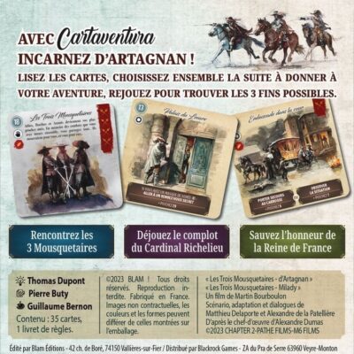 Dans Cartaventura – Les 3 Mousquetaires, Incarnez Dartagnan ! Lisez les cartes, choisissez ensemble la suite à donner à votre aventure, rejouez pour trouver les trois fins possible. Dont 2 alternatives !