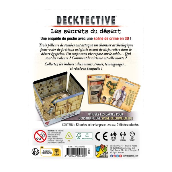 Decktective est une série de jeux d’enquête pour jouer seul ou entre amis. Les participants vont faire leur investigation à l’aide d’un décor en 3D réalisé à l’aide de cartes qui va évoluer au cours de leurs recherches. Les autres cartes serviront d’indices, d’événements à l’histoire et de rencontres avec des personnages.