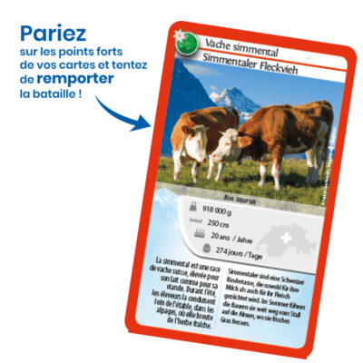 Le principe de Défis Nature – Suisse est simple : les enfants, à partir de 7 ans parient sur les points forts des animaux. Le joueur qui possède la plus forte caractéristique remporte les cartes des autres joueurs. Le premier à collecter toutes les cartes du jeu gagne la partie.