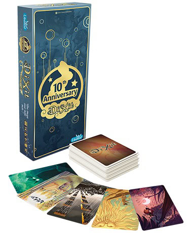 Dixit est né il y a 10 ans. Il est temps de fêter dignement cet anniversaire. Tous les illustrateurs ayant contribué au jeu par le passé ont à nouveau été invités à rejoindre l’aventure. Chacun d’eux a créé 11 nouvelles images et le résultat est époustouflant ! Marie Cardouat, Pierô, Xavier Collette, Clément Lefèvre, Franck Dion, Carine Hinder, Jérôme Pélissier, Marina Coudray et Paul Echegoyen ont réalisé des illustrations autour de contes du monde entier, pour former un ensemble homogène et unique… Pour les collectionneurs, ces 84 cartes peuvent être réparties comme 8 prolongements des précédentes boîtes de Dixit.