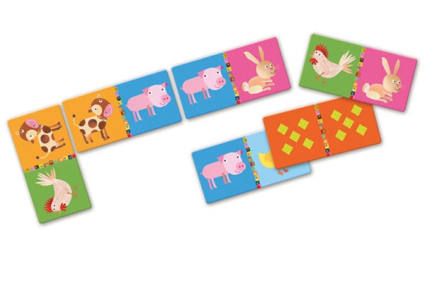 Le Domino fait plaisir aux tout-petits déjà. Il s’agit de bien disposer les éléments, de bien observer et de décider des cartes que l’on peut placer. Ce jeu contient plusieurs cartes colorées et joliment illustrées.
