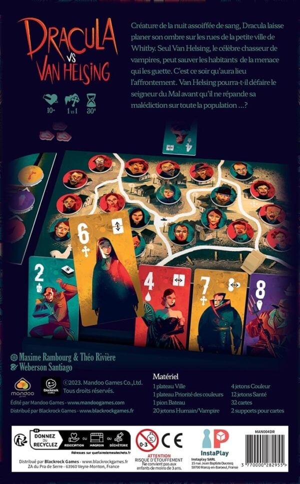 Dans le jeu asymétrique Dracula vs Van Helsing, chaque joueur a ses propres conditions de victoire : L’objectif de Van Helsing est d’éliminer tous les points de vie de Dracula, tandis que l’objectif de Dracula est de transformer les 4 habitants d’un même district en vampires.