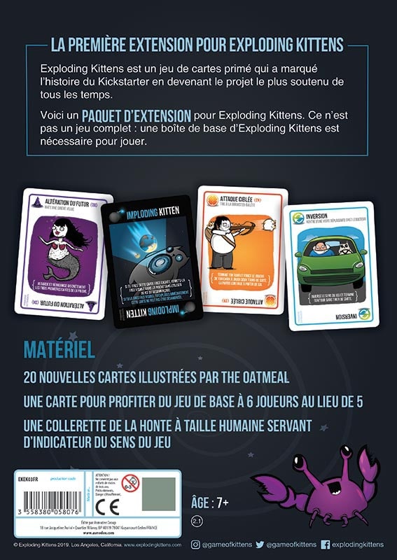 Imploding Kittens c’est 20 nouvelles cartes implosives, toujours illustrées par The Oatmeal, qui vous permettront enfin de jouer à 6.