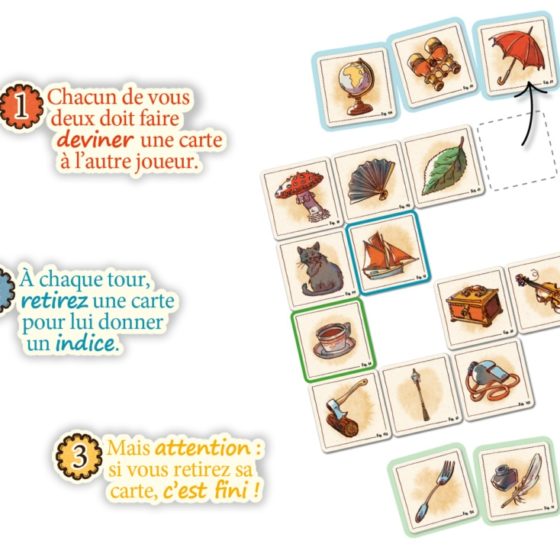 Un jeu très simple en apparence, qui cache une mécanique subtile. Les premières parties ne sont pas faciles puis on apprend à jouer et à communiquer uniquement grâce aux images. Au fur et à mesure, les stratégies se mettent en place et on gagne de plus en plus de parties, que l’on enchainent rapidement. On jeu que l’on ressortira souvent pour faire une partie rapide à deux joueurs !