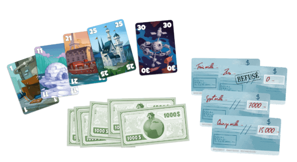 Redécouvrez le plaisir de For Sale, le célèbre jeu d’enchères, qui fait son entrée dans la célèbre collection « Mini Games » (Schotten Totten, Time Bomb…).