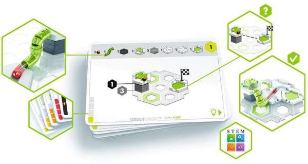 Avec 30 carte-défis et un ensemble de pièces de construction GraviTrax, le but du jeu est simple : permettre à la bille d’atteindre l’arrivée à l’aide des pièces de construction GraviTrax imposés sur la carte-défi.