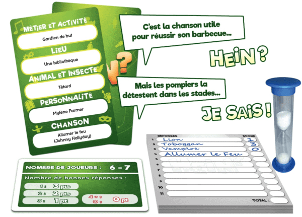 Le jeu où moins on comprend, plus on gagne ! C’est un animal très dangereux et qui aime bien avaler des billes … » – « HEIN ? » « Mais seulement quand on lui tape sur la queue » – « JE SAIS ! » Essayez de décrire des personnalités, des animaux, des chansons et plus encore … Mais faites-le de façon incompréhensible ou bizarre. Votre but est simple : que le moins de personnes possible comprenne de quoi vous parlez ! Moins les joueurs trouvent plus on marque de points. Mais attention, au moins un joueur doit quand même trouver la réponse. Alors parlez, mimez, chantez … décrivez vos sujets comme vous le souhaitez en essayant de ne pas trop en dire. Et repérez autour de la table quels joueurs semblent vous comprendre pour savoir quand vous arrêter ! Hein ? Famille & Culture Pop contient 500 sujets variés pour toute la famille. Il inclut aussi une variante rapide pour jouer en 5 minutes et un paquet promotionnel avec des exemples entendus pendant des parties.