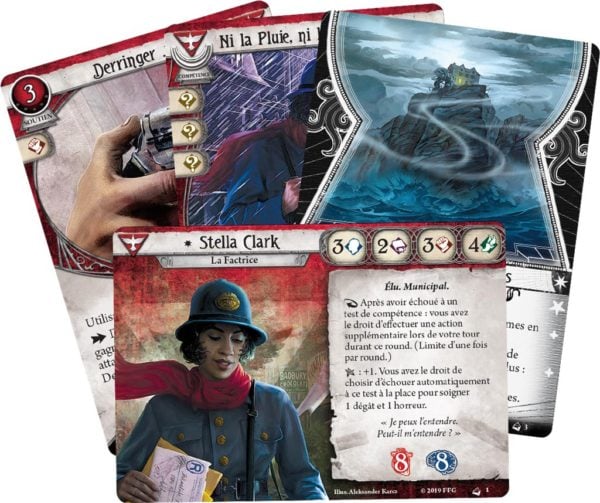 Stella Clark est une extension au jeu de cartes Horreur à Arkham proposant un deck Survivant prêt à jouer ainsi que 24 améliorations pour jouer en mode Campagne.