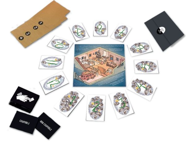 Dans l’Affaire des Huitres, effectuez les actions demandées selon l’ordre et les indications des 12 Cartes Jurés distribuées parmi les joueurs.