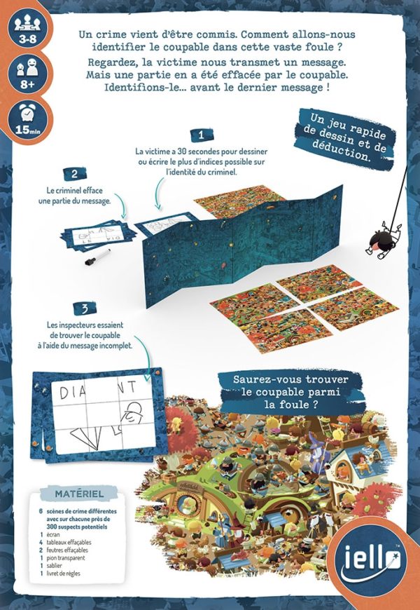 Les 3 à 8 joueurs se divisent en trois rôles. Une victime. Un coupable. Des enquêteurs. Le crime a eu lieu dans la foule : identifier le coupable sera donc particulièrement complexe. Mais heureusement, la victime peut encore transmettre des indices aux enquêteurs quant à l’identité du coupable. Feutre effaçable en main, elle peut écrire ou dessiner des informations permettant de l’identifier sur une ardoise découpée en 9 cases. Attention : la victime ne dispose que de 30 secondes pour composer son message. L’ardoise est ensuite transmise… au coupable.