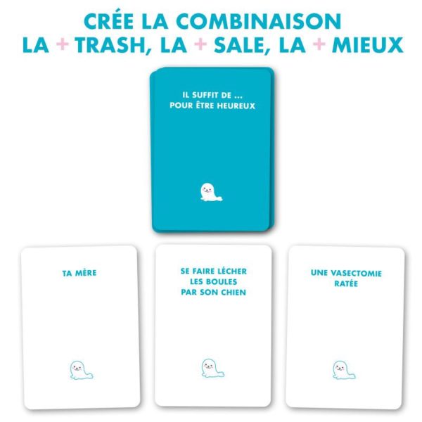 Le but : faire des combinaisons de cartes drôles pour faire rire tout le monde. Le meilleur des jeux humour noir du moment !