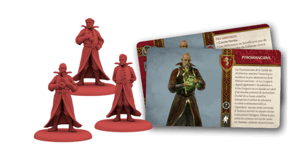 Après avoir longtemps gardé le secret de la fabrication du Feu Grégeois, la Guilde des Alchimistes offre désormais ses services à la Maison Lannister. Le Feu Grégeois est une substance verdâtre dotée d’un énorme potentiel explosif. Le feu, la chaleur, voire un simple choc peuvent faire exploser la substance, qui brûle ensuite d’une flamme verte jusqu’à ce qu’elle soit complètement consumée. Les armures sont inutiles face à ce type d’attaque et même les vétérans les plus endurcis cèdent à la panique face à de tels ravages. Cependant, les Pyromanciens sont incapables de porter quelque forme d’armure que ce soit et, au vu du danger qu’ils représentent, ils sont souvent pris pour cible par les tirs de l’ennemi. Malgré tout, lorsqu’ils sont employés à bon escient, les Pyromanciens peuvent causer un véritable carnage dans les rangs adverses.