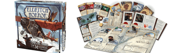 Ce qui se passe dans l’Antarctique a des répercussions dans le monde entier puisque cela engendre des horreurs fraîchement éveillés à travers le globe. Huit enquêteurs offrent de nouveaux rôles à jouer. Vous devez faire face à des menaces inhumaines. De nombreux autres biens, sorts, artefacts et conditions peuvent aider les enquêteurs ou leur nuire, et pour la première fois, les cartes Aventures et les cartes Préludes façonnent la lutte internationale contre les Anciens. Aurez-vous la force de survivre aux étendues glacées de l’Antarctique, rencontrer les Montagnes de la Folie, et conjurer la fin de la civilisation humaine ? Le plateau additionnel contenu dans « Les Montagnes Hallucinées » permet aux joueurs de suivre la piste de la maudite expédition menée par l’Université Miskatonic. Votre porte d’entrée vers la lointaine Antarctique ‘ et votre dernière connexion avec le reste du monde ‘ est l’Avant-poste Miskatonic, dans lequel vous pouvez faire équipe avec un guide de l’Antarctique ou obtenir du matériel médical de survie. Vous pouvez ensuite progresser vers le Camp de Lake dévasté, où le froid conserve les restes macabres du Professeur Lake et de ses collègues. Là-bas, vous pourrez secourir les chiens de traîneau effrayés qui ont survécu au massacre de leurs maîtres, ou faire l’autopsie des corps gelés de Choses Très Anciennes. Par-delà les immenses et inquiétantes Montagnes Enneigées s’étendent la mégalithique Cité des Choses Très Anciennes et le mythique Plateau de Leng, au sein desquels d’imprévisibles et transdimentionnels changements de temps et d’espace pourraient bien vous coûter votre santé mentale.