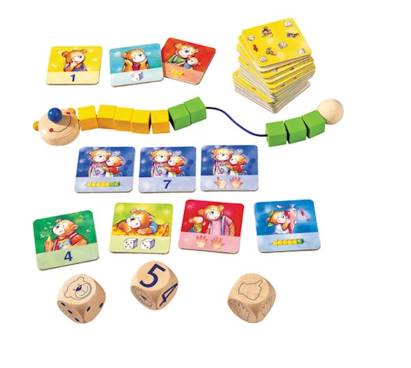 Un, deux, trois: l’ours savant compte avec moi ! Dans quatre jeux différents, l’ours savant initie les enfants aux chiffres de 1 à 10 et leur apprend à faire des premiers exercices de calcul. Le lacet « boulier » de l’ours savant et les dés à symboles ou chiffres leur seront une aide utile.