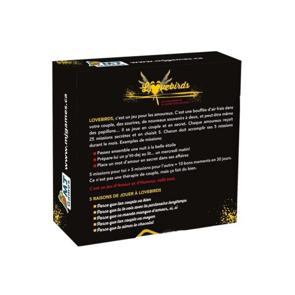 Lovebirds, c’est un jeu pour les amoureux. C’est une bouffée d’air frais dans votre couple, des sourires, de nouveaux souvenirs à deux, et peut-être même des papillons… Il se joue en couple et en secret. Chaque amoureux reçoit 25 missions secrètes et en choisit 5. Chacun doit accomplir ses 5 missions durant le mois.
