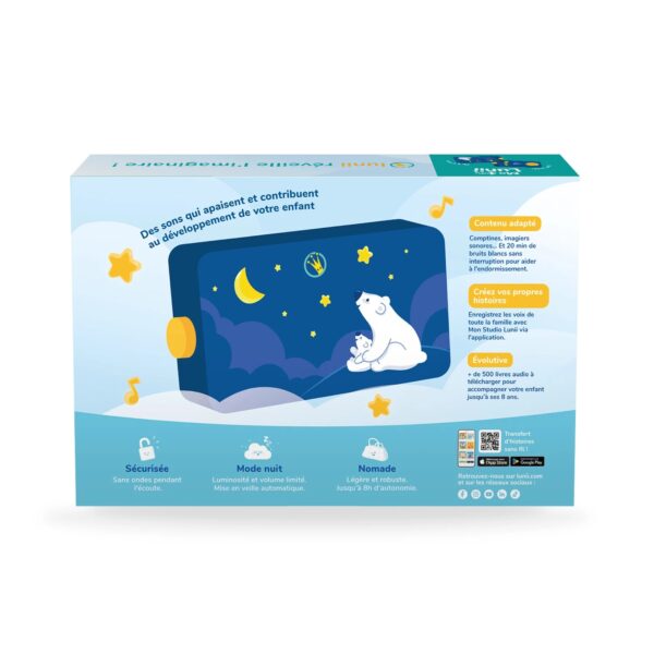 Une conteuse au contenu pensé pour les jeunes enfants : comptines, imagiers sonores… et jusqu’à 30 min de bruits blancs sans interruption pour aider à l’endormissement. Avec ses sons joyeux et apaisants, Ma 1ère Lunii stimule le langage et favorise l’éveil musical de votre enfant.
