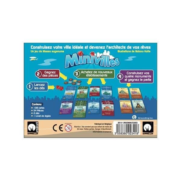 Dans le jeu Minivilles, vous achetez des cartes qui représentent divers types d’établissements pour composer votre ville. Vous débutez avec un champs de blé et un boulangerie et devez ainsi constituer petit à petit la ville pour parvenir à construire quatre bâtiments majeurs – les monuments – qui sont le signe de la victoire.