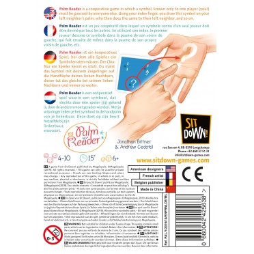 Palm Reader est un jeu coopératif dans lequel un symbole connu d’un seul joueur doit être deviné par tous les autres. En utilisant uniquement son index, le premier joueur dessine ce symbole dans la paume de son voisin de gauche, qui fait ensuite de même dans la paume de son propre voisin de gauche, et ainsi de suite sans que jamais personne ne puisse voir ce qui est dessiné. À chacun ensuite de deviner quel est le symbole qu’il a senti qu’on lui dessinait dans la main. Tous les joueurs tentent d’atteindre ensemble le score le plus élevé possible.