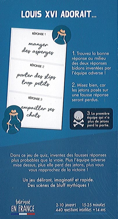 Exemple : comment s’appelait le chien de Jacques Chirac à la mairie de Paris ? Quand une équipe questionne l’autre, elle essaie de l’induire en erreur en lui présentant 3 choix de réponse : – la bonne réponse, – 2 réponses « bidons » qu’elle vient d’inventer !