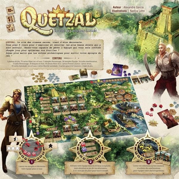 Les joueurs ont 5 tours pour explorer l’île de Quetzal et collecter de précieux artefacts. Ils lancent leurs meeples et les envoient dans les différents lieux de l’île pour récupérer des artefacts. Ils les livrent ensuite pour améliorer leurs fouilles ou marquer des points de victoire et tenter de gagner la partie.