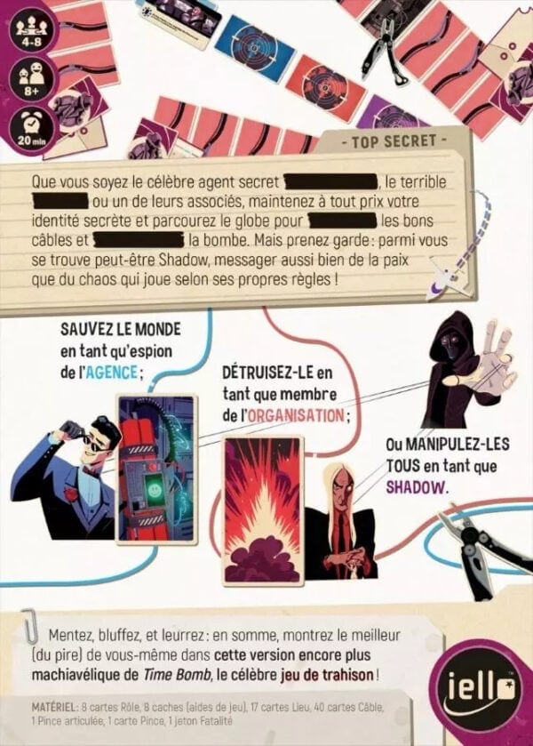 Dans le jeu TimeBomb Undercover, vous faîtes partie de l’une ou l’autre des équipes… à moins que vous ne soyez celui qui se cache derrière Shadow… le nouveau rôle solitaire qui a ses propres desseins…