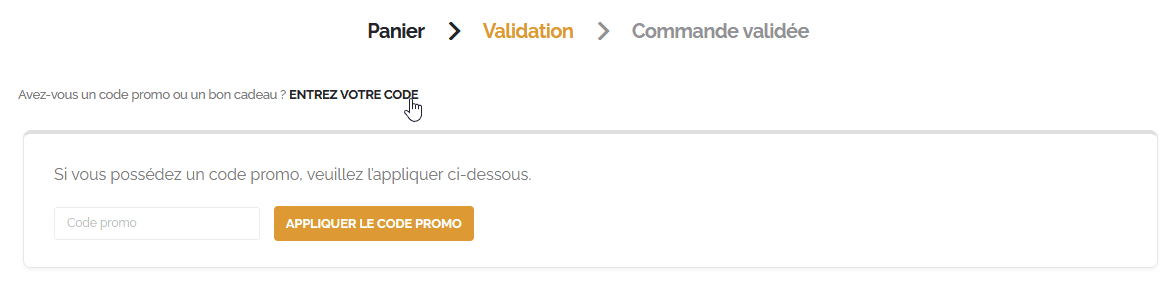 Lors de la validation votre commande, cliquez sur « Entrez votre code » situé après « Avez-vous un code promo ou un bon cadeau ? « .